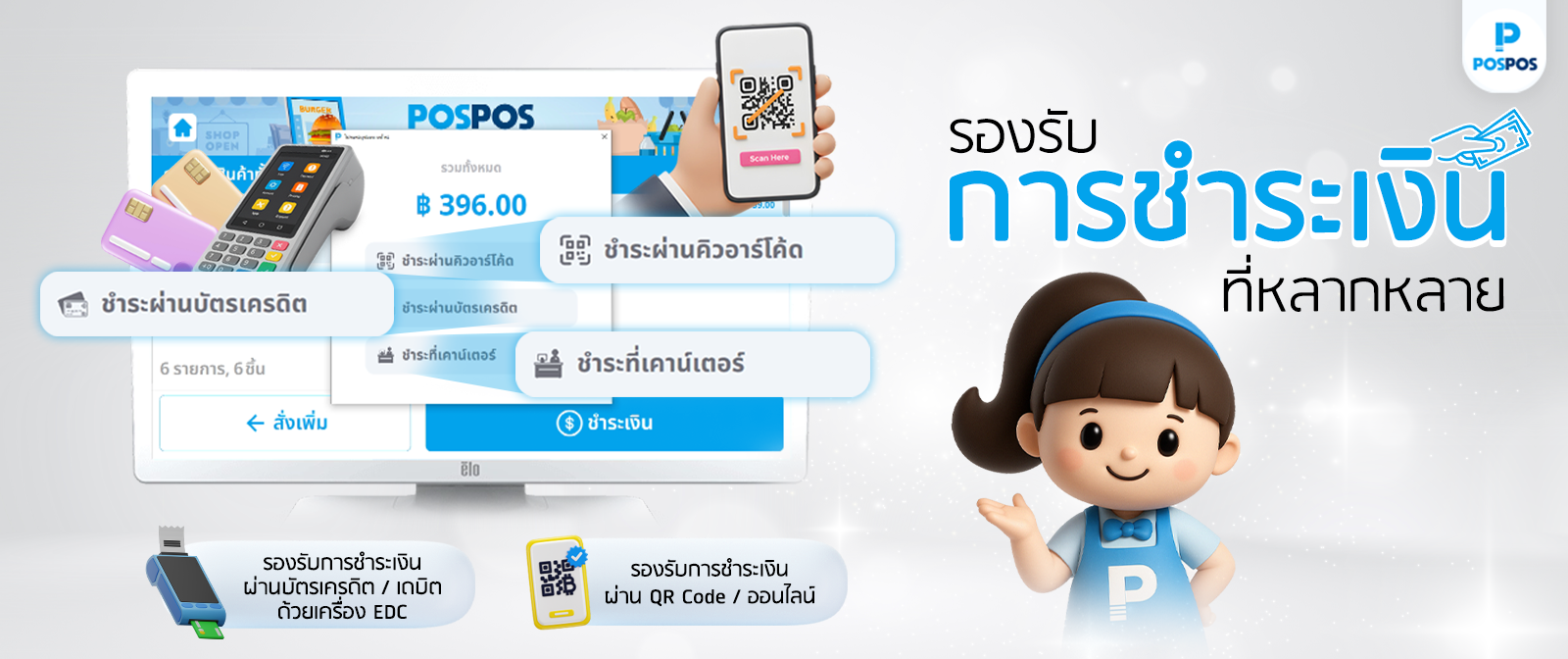 รองรับการชำระเงินผ่านบัตรเครดิต/เดบิต ด้วยเครื่อง EDC : รองรับบัตรเครดิตและเดบิตจากธนาคารและผู้ให้บริการต่างๆ ด้วยการเชื่อมต่อกับเครื่อง EDC หรือเครื่องรูดบัตร
