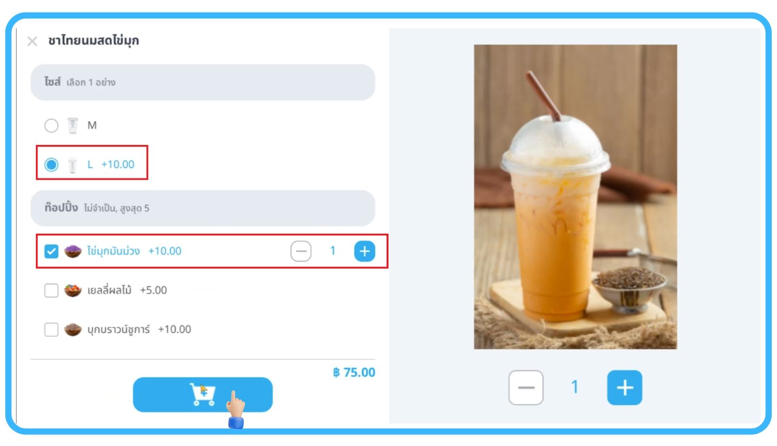 - เลือกขนาดพร้อมท็อปปิ้งต่างๆ ที่ลูกค้าต้องการ พร้อมแอดสินค้าลงตระกร้า