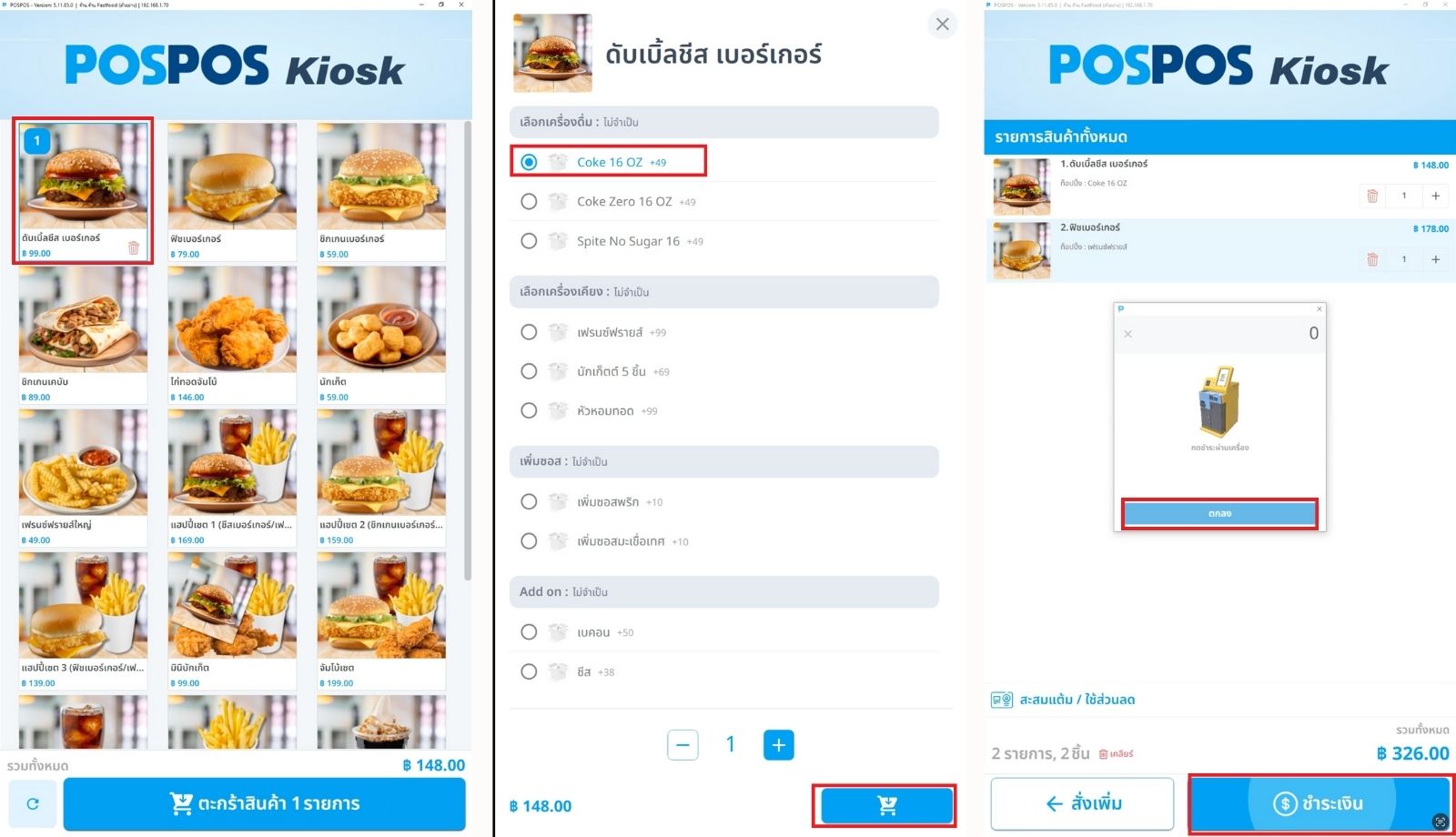 - ทางเลือกการชำระเงินครบวงจร: ลูกค้าสามารถเลือกวิธีการชำระเงินได้ 2 รูปแบบหลัก คือ เงินโอน/QR Code (ซึ่งระบบ Kiosk ของ POSPOS รองรับอยู่แล้ว) หรือ เงินสด