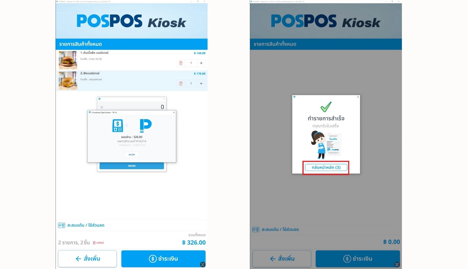 - การแสดงยอดชำระแบบคู่: เมื่อลูกค้ากดชำระเงิน ยอดรวมทั้งหมดจะปรากฏขึ้นพร้อมกันทั้งบนหน้าจอ Kiosk ของ POSPOS และหน้าจอของตู้เก็บเงิน Tiger Cashbox