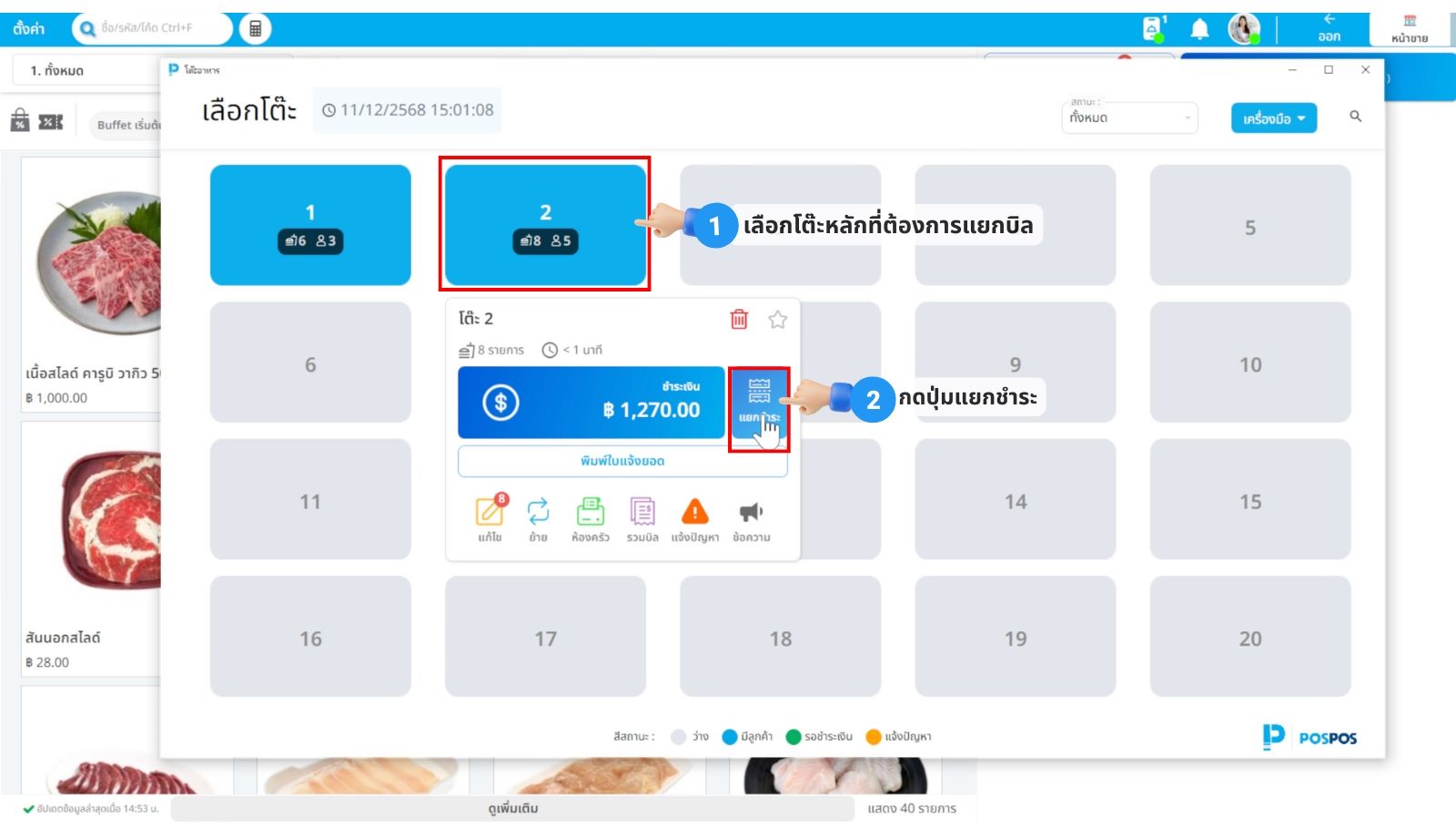 เมื่อลูกค้าต้องการเช็คบิลแยก ให้พนักงานไปที่หน้าผังโต๊ะ (Table Layout)